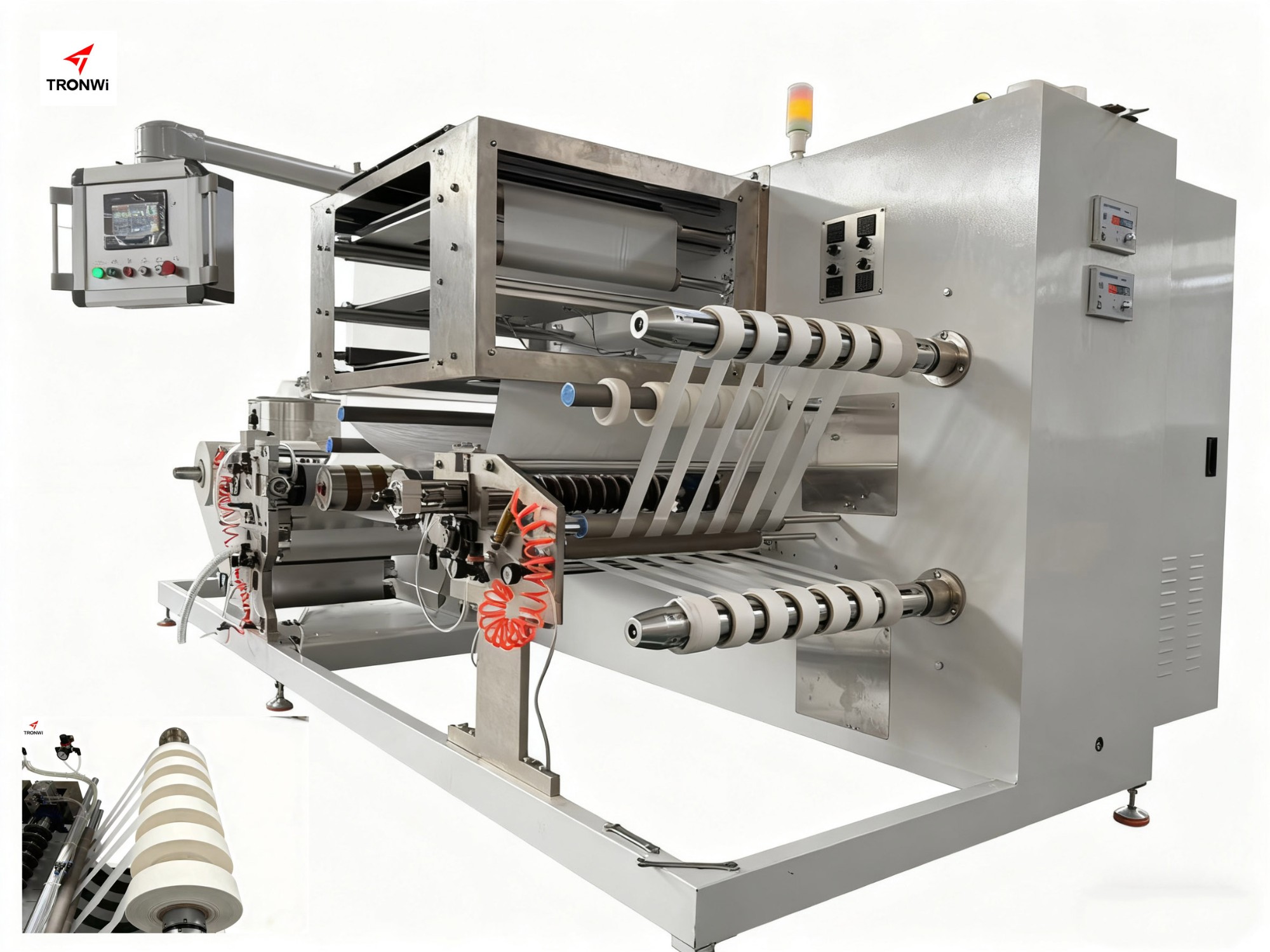 17. Rewinding mechanism: The mechanism uses a servo motor to control the rewinding, thereby ensuring the tension and tightness of the rewinding, and rewinding through the control of the air expansion shaft, thereby ensuring the tightness and neatness of each roll.